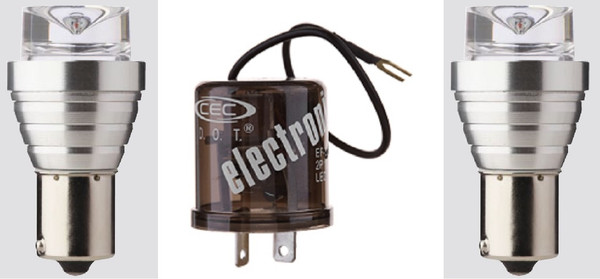 This kit includes 2 Amber LED Bulbs with a 15mm single contact bayonet base (see images), and an LED-compatible 2-prong flasher.
