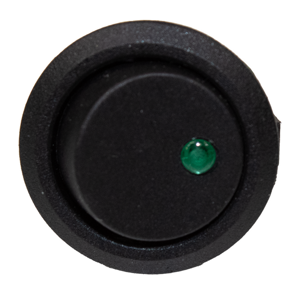 Round rocker switch for automotive/boad/RV applications, can switch up to 20 Amp. The green LED lights up when the switch is in the ON position, and goes dark in the OFF position.